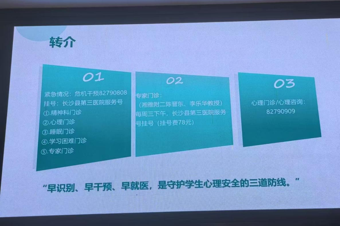 2025年11月28日下午14:00,国际商学院24、25级部分心理委员于图书馆孔子讲堂参与本校与长沙县第三医院医校合作签约授牌活动。本次活动围绕学生心理安全防护体系展开,明确了心理支持转介渠道,包括紧急情况干预热线、专家门诊挂号方式及日常心理咨询联络途径;同时厘清了心理干预中的角色定位,强调相关人员需以“第一识者”“支持者”的身份开展工作,聚焦识别、支持、转介三大任务并严守工作边界。
