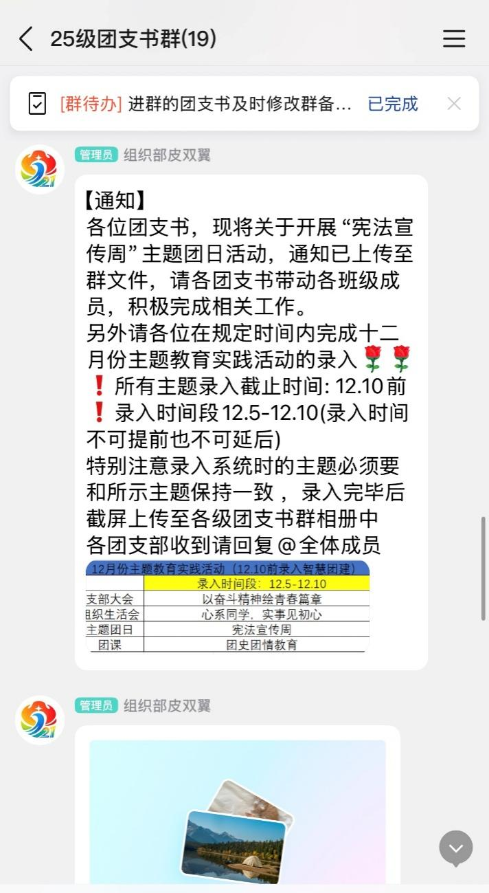 核心工作具体开展情况如下:2025年12月4日中午12:30,入团积极分子第八次团课在第三报告厅顺利开讲,参训人员全员到齐,学习态度端正;同步筹备的入团积极分子团务知识竞赛定于2025年12月7日晚19:00在信息中心楼402教室举办,目前各项筹备工作均已就绪;组织各班开展“宪法宣传周”主题团日活动,进一步强化全体成员的法治意识;完成25级国际商学院基层团组织信息更新工作,保障基础数据精准无误;推进“4M课程”相关事宜,顺利完成当期课程开展及配套截图收集工作。