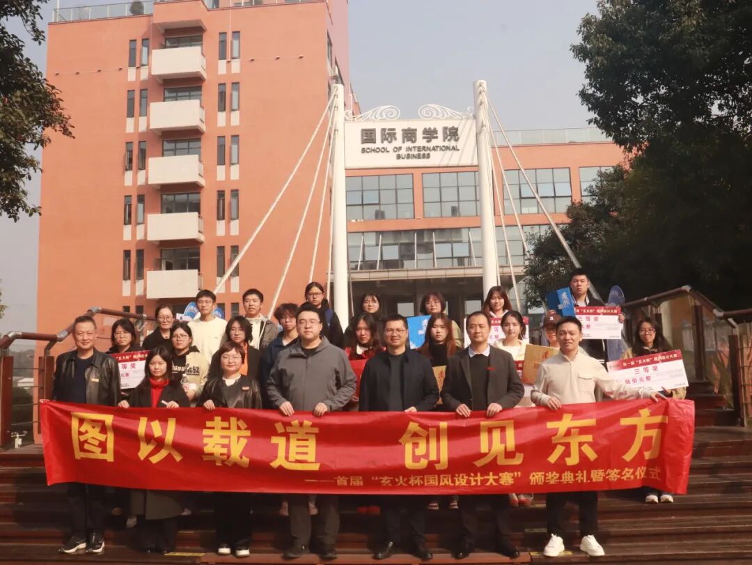 仪式最后,所有评委、获奖同学及工作人员移步至商学院四楼桥头合影留念,为第一届"玄火杯"国风设计大赛画上圆满句号。