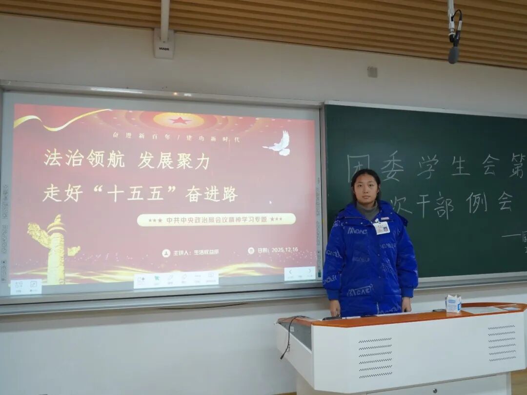 最后,生活权益部负责人柳诗雅带领大家学习了“中央政治局会议精神”。她重点解读了“稳中求进”的2026年经济工作定调及《中国共产党领导全面依法治国工作条例》的核心要义,并号召全体成员将法治思维融入团学管理,规范日常工作,在服务同学中践行团学的使命。