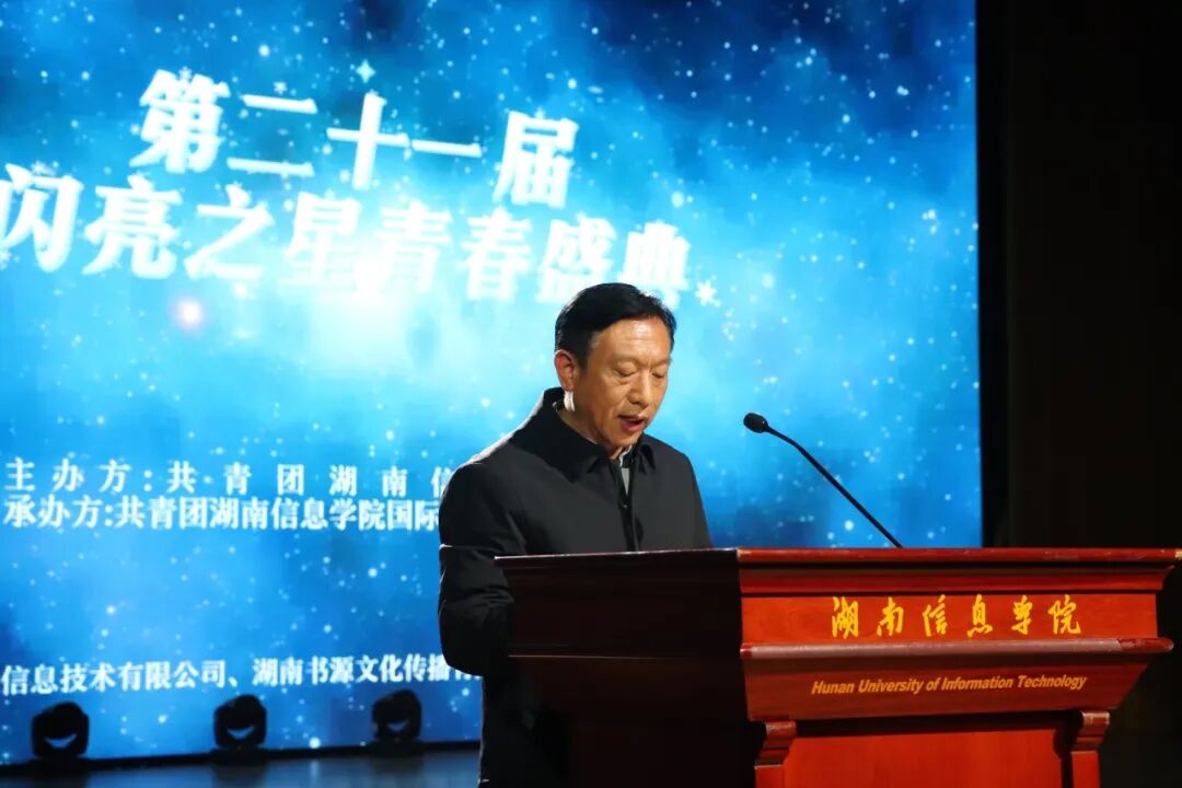 活动伊始,由学校党委委员、副校长黄涛上台致辞。他指出,第二十一届“闪亮之星”以“廿一燃薪火,星芒映湘信”为魂,以四大赛道为载体,将思想引领融入艺术展演,既是展示学子多元才华、创新精神的重要平台,更是落实立德树人根本任务、传承红色薪火的生动课堂。黄涛副校长向参与活动的师生、校友及幕后工作人员致以诚挚感谢,并寄语湘信学子以“闪亮之星”为榜样,让传承薪火在青春赛道越燃越旺,以个人星芒汇聚成学校发展的璀璨星河。