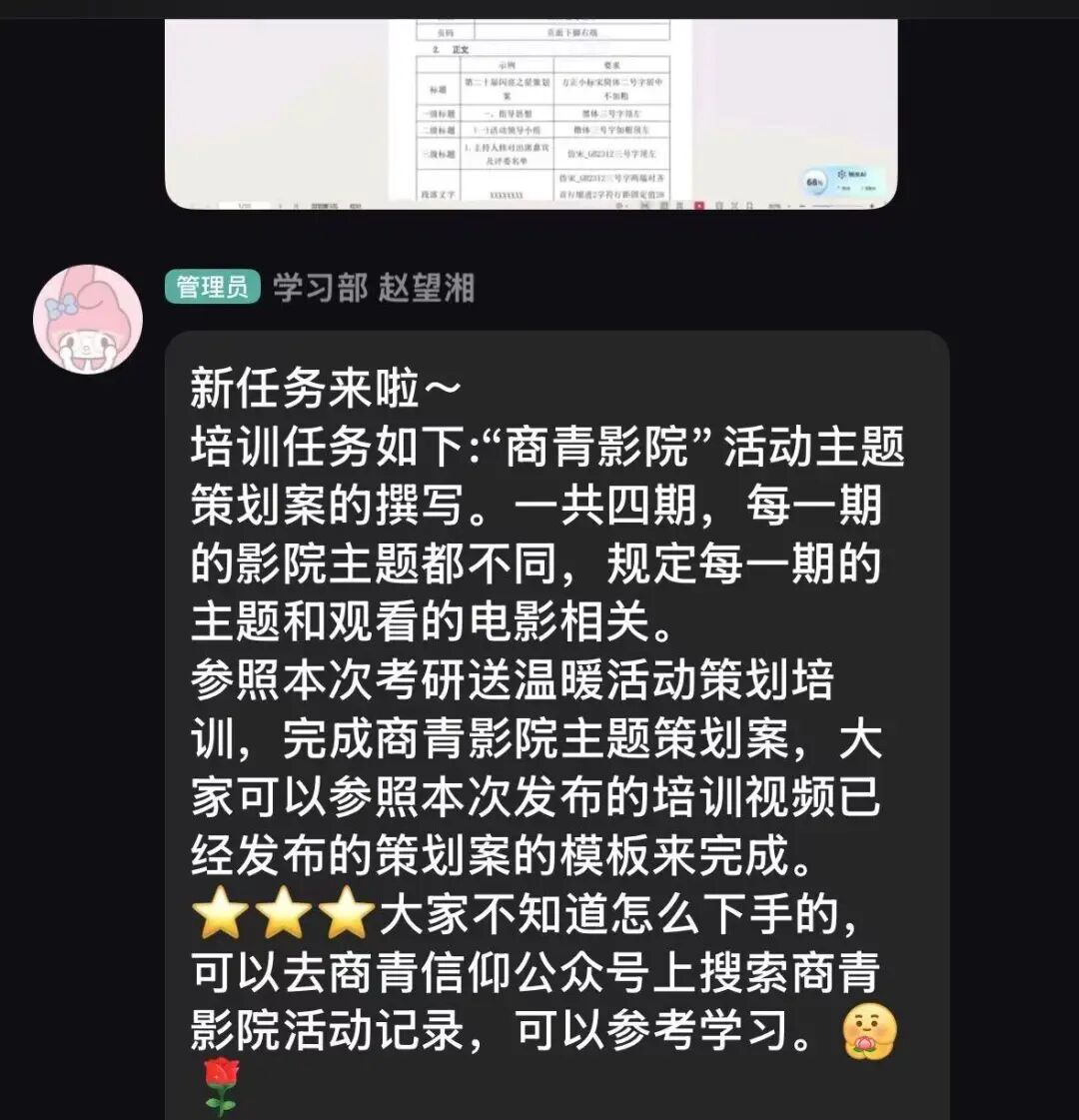 为强化留任干事能力,学习部负责人赵望湘针对策划案的撰写与活动流程梳理开展培训工作。培训围绕“商青影院”四期主题策划案展开,指导干事参照既有模板与培训视频,学习策划结构搭建、内容撰写及格式排版规范,有效提升了干事的策划撰写能力。同时,学习部同步推进新学期第一期“商青影院”活动前期筹备,完成活动人员分工梳理等工作,为后续活动顺利开展做好铺垫。