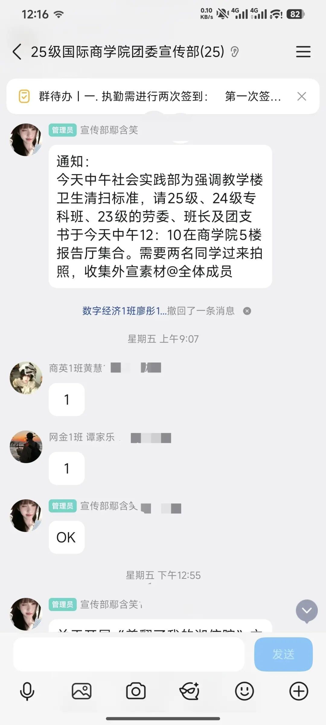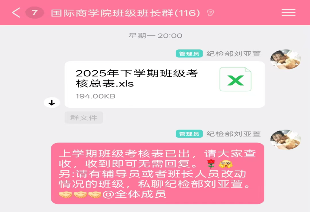 本周,纪检部负责人刘亚萱统筹推进班级基础信息核对工作:一方面,在国际商学院班级班长群发布《2025年下学期班级考核总表》,完成上学期班级考核数据的汇总与公示,同时提醒存在辅导员或班长人员变动的班级,报备纪检部进行更换,确保信息准确更新;另一方面,纪检部内部通过群聊开展工作交流,针对一些班级辅导员更换等信息变动情况,同步完成内部记录与核对,为后续考核工作奠定基础,文明督导工作也有序开展。接着,持续跟进各班级人员变动信息,梳理本周工作数据,为新学期班级日常考核工作制定初步计划。