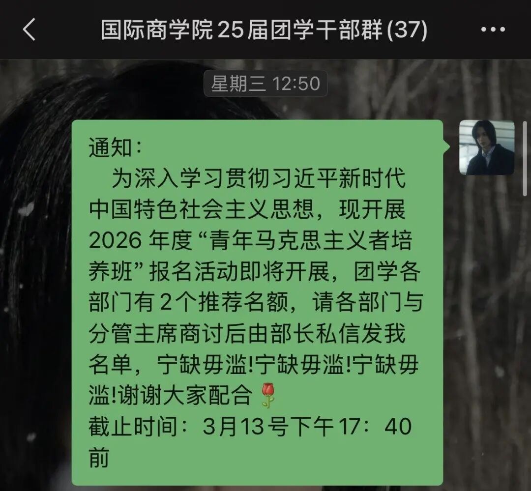推进青马工程报名工作:正式启动2026年青年马克思主义者培养工程报名相关工作,强调“宁缺毋滥”的筛选原则,同时开展报名宣传动员、信息登记工作,对报送的推荐名单进行规范初审,确保报名流程合规、信息准确。严把团员发展入口关:完成各部门入团积极分子的推荐收集工作,严格依据团员发展相关标准与要求,对入团积极分子的推荐材料进行全面、细致审核,重点核查材料完整性、信息真实性,坚决杜绝不符合条件的人员进入入团积极分子队伍,切实夯实团员发展的基础工作。统筹协调日常团务:及时对接团学各部门,做好工作沟通与衔接,针对青马工程报名、入团积极分子推荐过程中各部门提出的疑问进行耐心解答,保障各项团务工作推进顺畅。