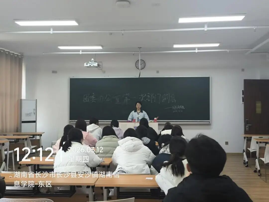 新学期伊始,为规范部门日常工作秩序、明确岗位职责与纪律要求,保障各项工作高效推进,办公室于2026年3月12日中午12:20在信息中心楼504教室召开本学期第一次部门例会,例会由办公室负责人易瑟圆主讲。会议首先确定了全体干事的留任意向,为后续工作调配做准备,同时明确值班安排,并对即将于4月初开展的团学大练兵活动进行预告,要求全体干事做好相关准备。随后对卫生工作做出部署,要求实行每日打扫制度,保持办公桌桌面整洁,打扫完成后需拍照打卡上传至QQ群。最后强调考勤纪律,要求全体成员严格遵守出勤规定,杜绝消极怠工现象。