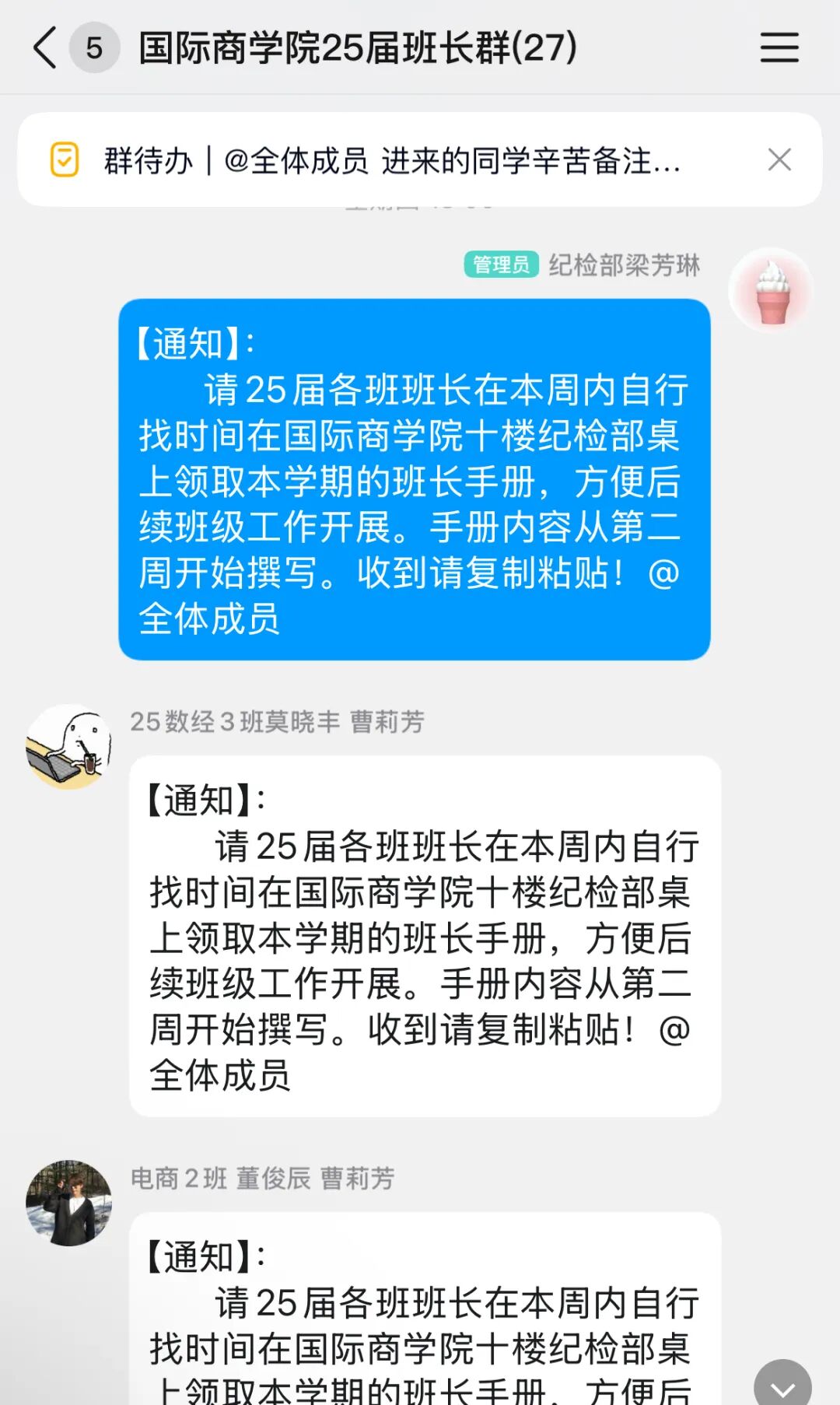 同时,为强化班级管理规范化建设,纪检部向25届各班班长发放新版《班长手册》。手册涵盖班级日常管理、学风建设、活动组织等核心内容,为新任班长提供了清晰的工作指引,助力提升班级管理效能。