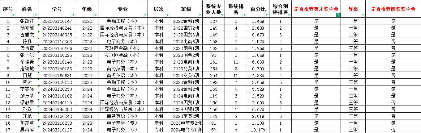 经学生本人申请,学院初审,学校复审(评分),学院党政联席会议根据学校终审分高低排序,结合学生在校表现,讨论研究决定推荐2022级本科张政红等5名同学,2023级本科张子航等5名同学,2024级本科李雯婷等5名同学,2023级专科熊莎萱,2024级专科吴海滨,参评第十届湘信英才奖学金。推荐张政红等9名同学参评国家奖学(详细名单见表格)。