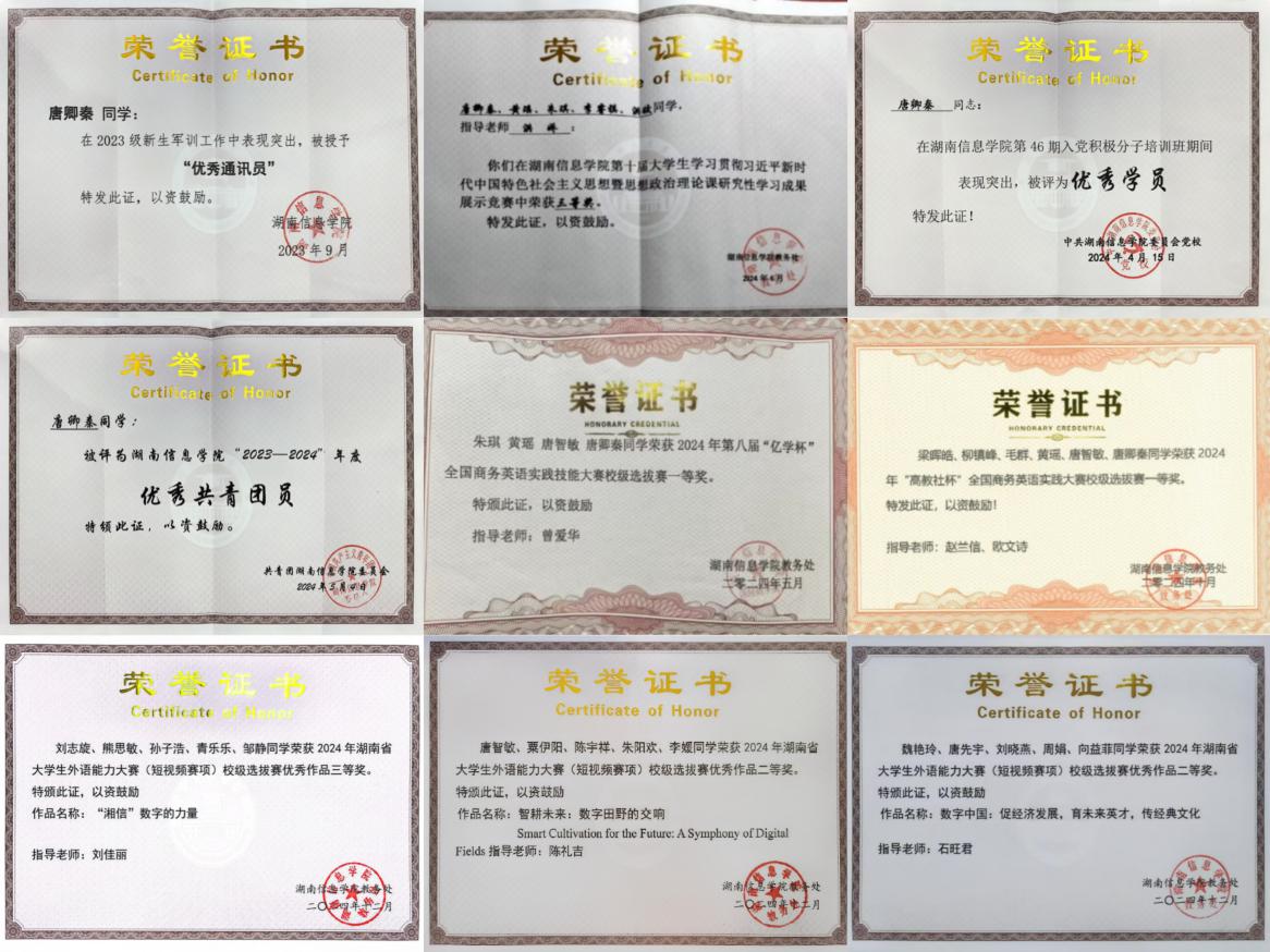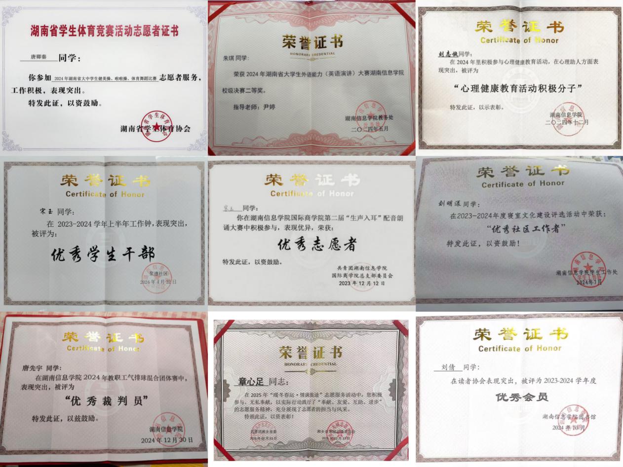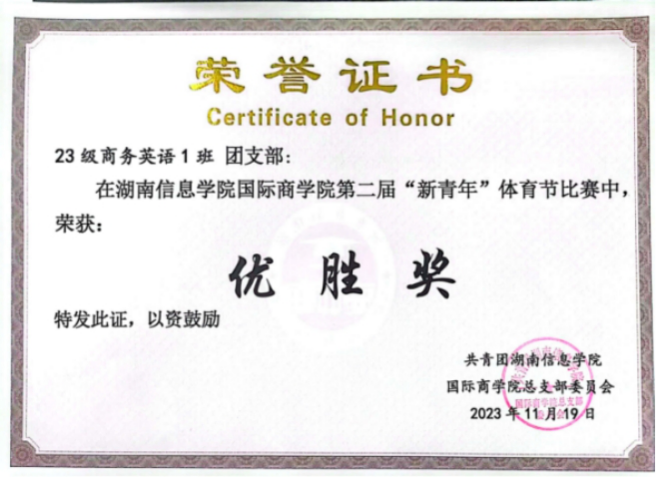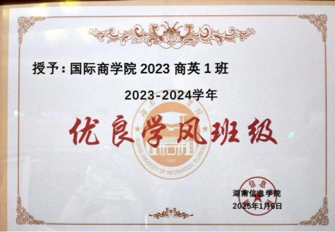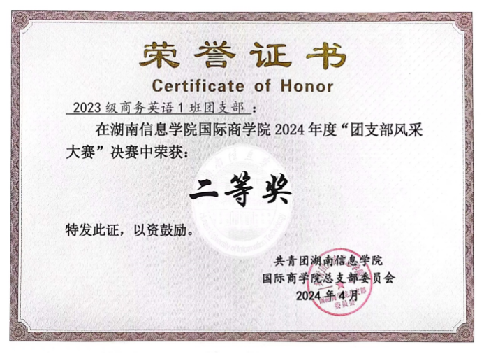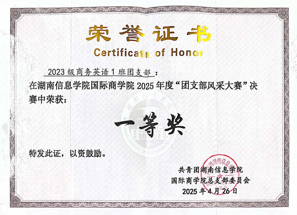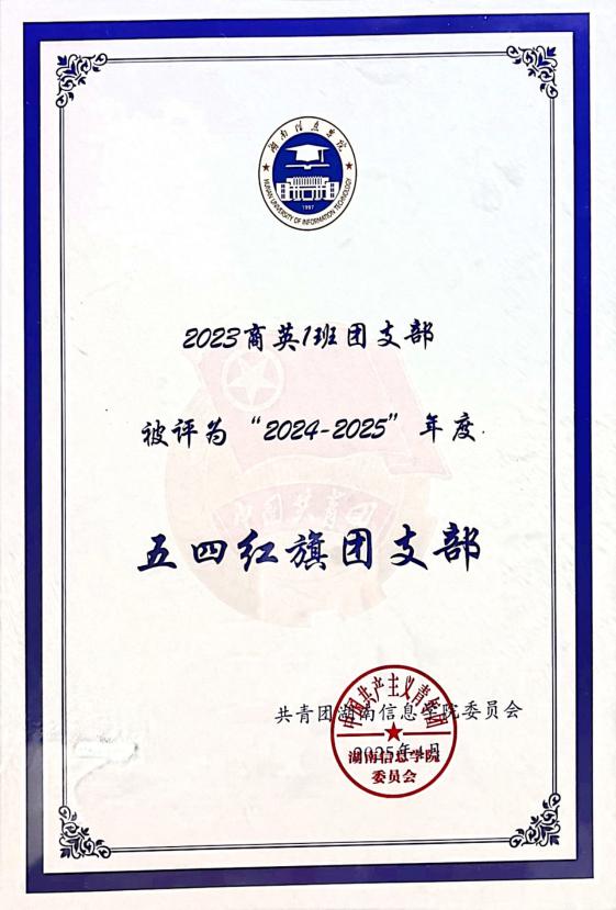 2023商英1班团支部成立于2023年9月,支部共有团员24名,青年22名,其中发展预备党员2名,入党积极分子14名。支部组织架构完善,在辅导员刘佳丽老师的管理下,井然有序。支部成员积极向上,勇于创新,获得诸多荣誉奖励。自成立以来荣获2023级新生军训中荣获优秀连队称号,2023-2024学年“优良学风班级”称号,2024-2025学年校级“五四红旗团支部”称号,湖南信息学院国际商学院第二届“新青年”体育节优胜奖,2024年度湖南信息学院国际学院“团支部风采大赛”决赛二等奖,2025年度湖南信息学院国际学院“团支部风采大赛”决赛一等奖等荣誉奖励。