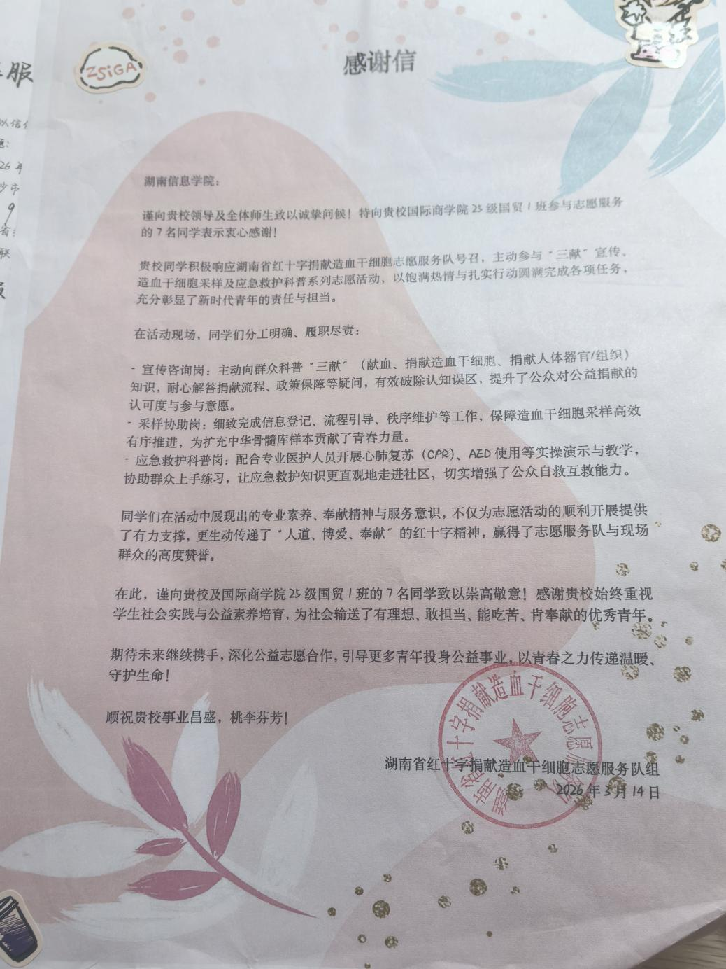 这份来自湖南省红十字捐献造血干细胞志愿服队组的感谢信,