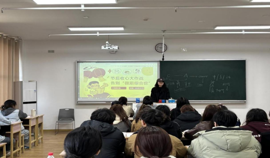 3月13日,23商英5班在信息中心楼804教室开展主题班会。班会以假期综合征趣味自测开场,帮助同学们清晰识别自身状态;随后讲解作息紊乱、压力焦虑等核心成因,并带来番茄工作法、逐步调整作息等可落地的调适技巧。