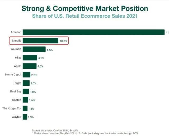 Shopify早期的定位是一款专为中小型商家提供SaaS服务的电商建站工具,帮助商家从零开始创建一家网店。近些年来,Shopify围绕电商网站搭建服务,不断拓展自身业务边界,建立自己的生态系统。特别是疫情期间,以Shopify为代表的独立站取得了快速发展。从2020年3月至2022年1月,Shopify累计增加了259.47万家在线商店,不到两年时间,增幅高达201.53%。其中2021年Shopify上商品成交总额达到了1754亿美元,在全美零售电商销售额中占10.3%,位列第二。Shopify从不被亚马逊看好成长到如今能威胁亚马逊电商巨头地位的存在。