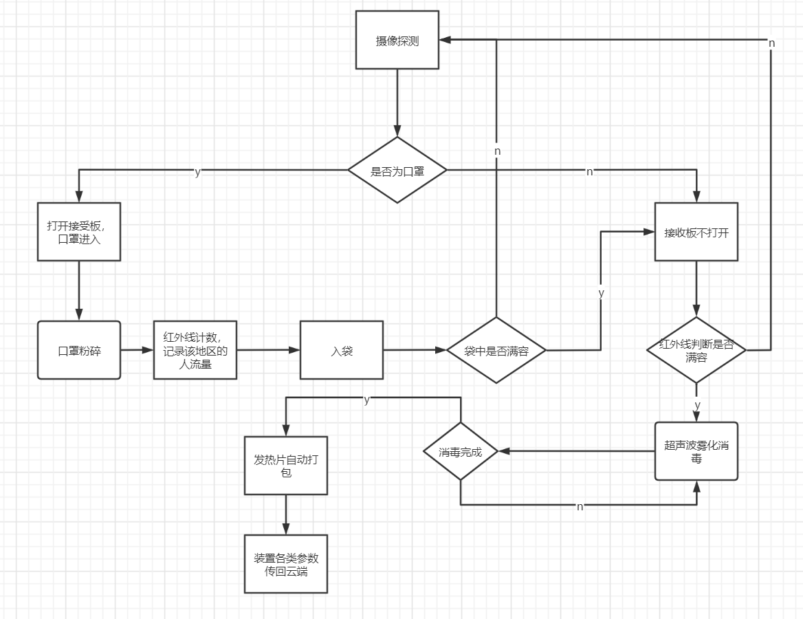 随着疫情防控时间的不断增长,全国人民每天需要的口罩高达 5.05 亿只,面对口罩回收效率低,不规范和口罩难回收等问题以及口罩乱丢乱扔等现象造成的城乡社区环境和自然环境的污染,引起了不少争议。智能口罩回收装置则通过无接触的口罩投递接口,口罩粉碎,定容消毒,自动打包和自动运输等模块解决相应的群众口罩回收意识薄弱,口罩被二次利用,病毒繁衍扩散和回收效率低等问题。